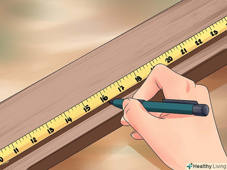 Зробіть позначки місць на верхній і нижній напрямній, до яких будуть кріпитися стійки. використовуючи рулетку і олівець, накресліть лінії на напрямних. На ці лінії ви будете кріпити стійки. Таким чином, у кожної стійки має бути три позначки на верхній і нижній частині: центральна точка і два краї кожної стійки. Для того щоб несуча перегородка витримувала навантаження, кожна стійка повинна бути встановлена через кожні 40 см, і ця відстань повинна бути вивірена досить точно.- Зробіть першу позначку "x" на відстані 40 см від краю рами, потім відніміть 9.5 см від цієї позначки і прокресліть лінію (на позначці 38.5 см). Використовуйте коротший шматок дошки квадратної рами - це буде точна ширина дощок 5 х 10 см, щоб відзначити лінію, де буде знаходитися край наступної стійки. Іншими словами, "х", який ви позначили на 40 см, означатиме центральну точку стійки, а дві лінії означатимуть сторони стійки. Це необхідно для обліку ширини кожної наступної стійки, щоб центр знаходився на рівній відстані від наступного.