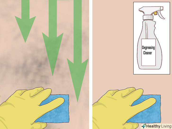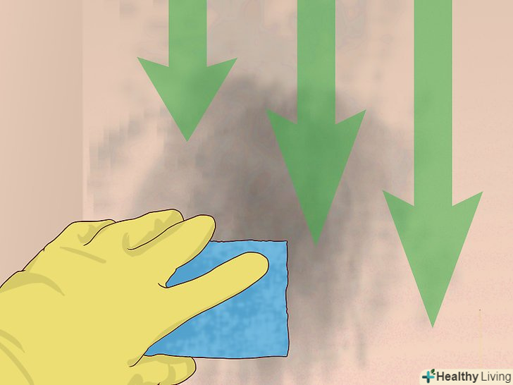 Обробіть стіну розчином знежирюючого миючого засобу. намочіть губку в розчині, а потім відіжміть з неї надлишки вологи. Протріть стіну вологою губкою, щоб прибрати залишкові сліди сажі. У міру забруднення губки споліскуйте її в чистячому розчині і знову віджимайте, щоб продовжити роботу. [9]- Так як основна частина сажі вже прибрана, а ви перете тільки її залишкові сліди, в даному випадку не потрібно застосовувати будь-яку спеціальну техніку очищення стіни.