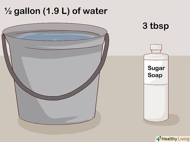 Приготуйте розчин знежирюючого миючого засобу. як тільки приберете саму сажу зі стіни, можна буде обробити залишкову пляму знежирюючим миючим засобом, наприклад, денатурованими спиртом, лужним господарським милом, миючим засобом на основі аміаку, тринатрійфосфатом, знежирюючим засобом для миття посуду або цитрусовим миючим засобом. Приготуйте в відрі розчин миючого засобу.- Щоб приготувати чистячий розчин з лужного господарського мила, додайте 3 столові ложки мила на 2 л води.