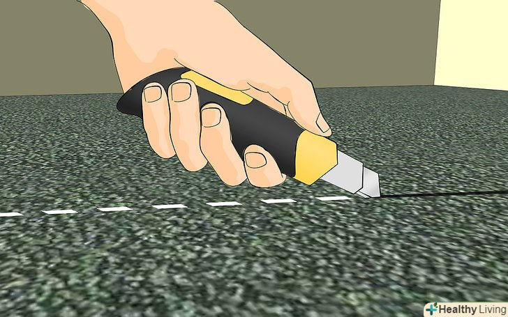 Використовуйте ніж або ніж для килима, щоб розрізати килим на більш податливі смуги і по ходу руху скачувати їх в рулон.- Якщо ви хочете зберегти те, що знаходиться під килимом, то переконайтеся, що не дряпаєте підлогу ножем. Як один із способів уникнути цього, можна це під час розрізання підняти килим над підлогою. Інший спосіб, це видалити килим великим шматком і розрізати де-небудь в іншому місці.