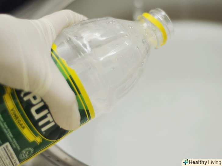 Нейтралізуйте залишки лужного розчину оцтом. у невеликій мисці з'єднайте одну частину яблучного оцту і чотири частини теплої води. Перелийте розчин в пляшку з розпилювачем.- Нанесіть засіб на непомітну ділянку килима, а потім побризкайте розчином на оброблену область і притисніть серветку ложкою, як і раніше. Промокніть паперовим рушником, щоб прибрати надлишки рідини. Від плями не повинно залишитися слідів. Якщо залишки плями ще видно, повторіть процедуру.