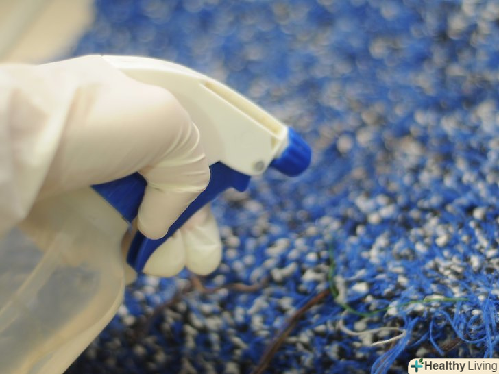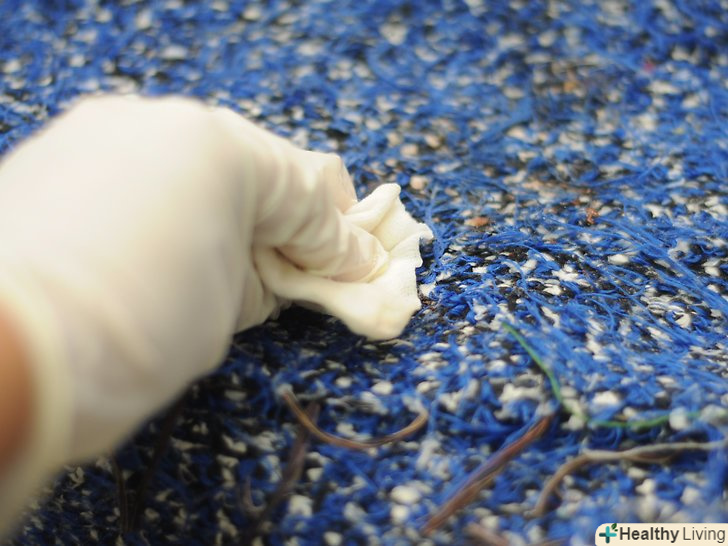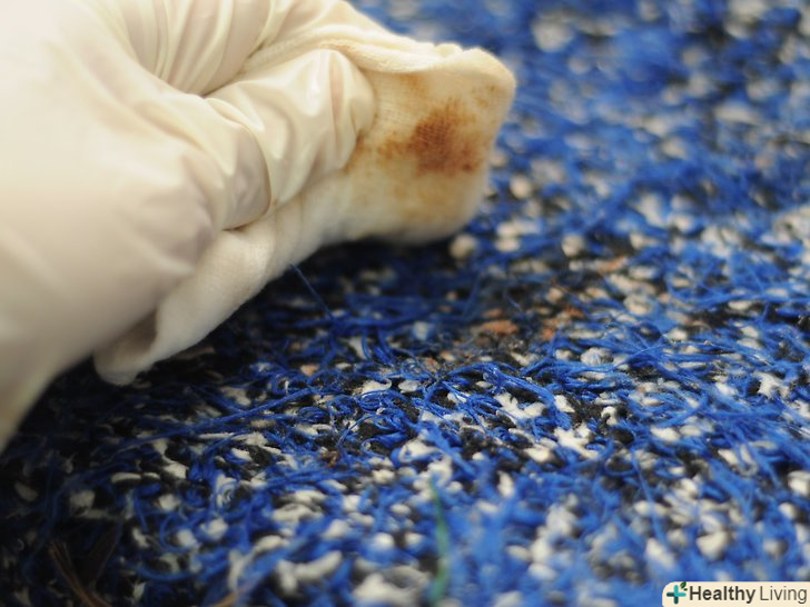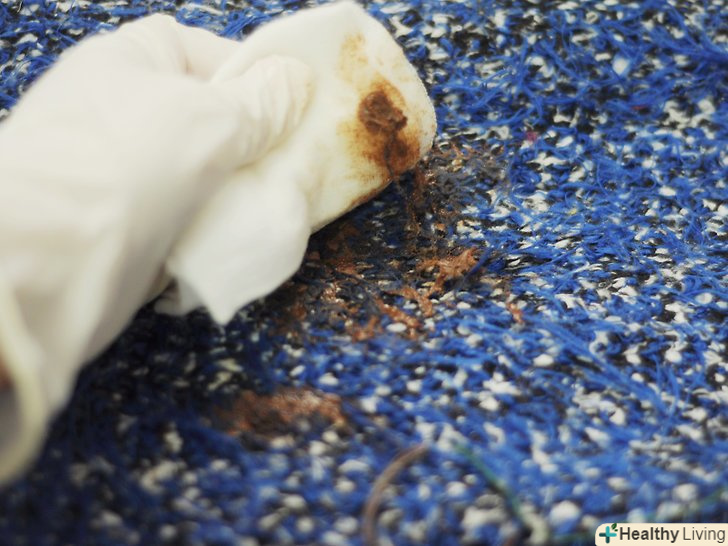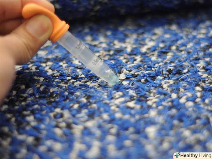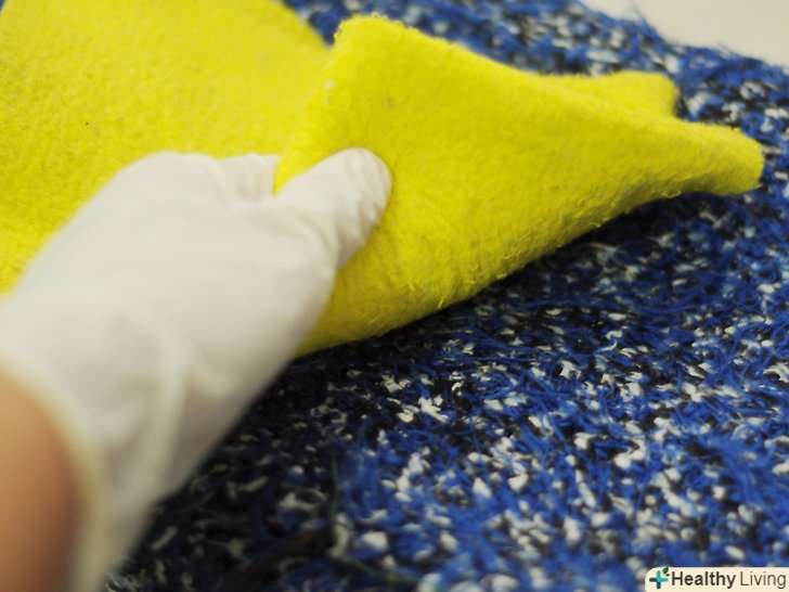 Нанесіть розчин на пляму. спочатку нанесіть розчин на непомітне місце. Якщо засіб не заподіяло ніякої шкоди ворсу, намочіть шматок тканини в розчині і покладіть на пляму.