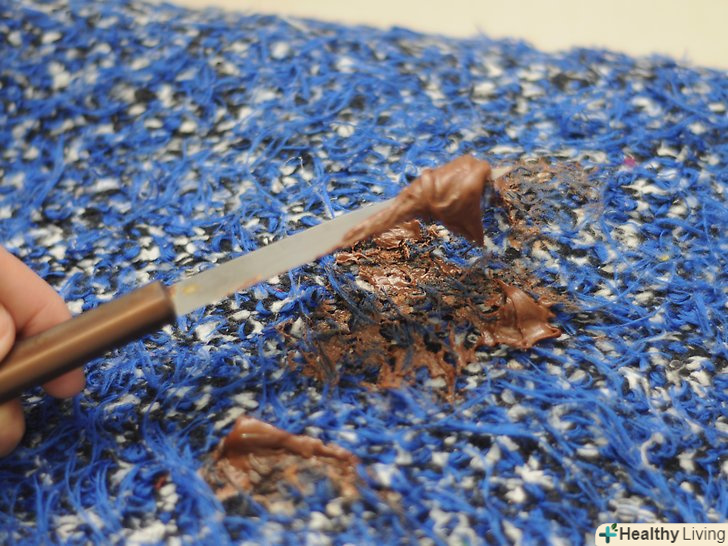 Зчистіть шоколад з поверхні. чистим тупим ножем без зубчиків зішкребіть якомога більше шоколаду з поверхні килима. Будьте обережні - не пошкодити ворс.- Складайте клаптики шоколаду на паперовий рушник. Протирайте ніж, щоб не розмазати шоколад по килиму.