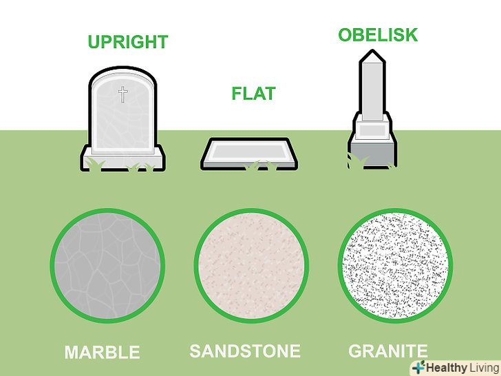 Виберіть правильний матеріал. після смерті близької людини доводиться приймати чимало рішень. Одне з них – вибір відповідного каменю для надгробка. Обміркуйте, який матеріал буде оптимальним. [10]- Спочатку виберіть тип надгробка – вертикальну, горизонтальну плиту або обеліск.