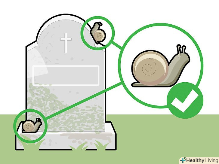 Використовуйте равликів. часом для очищення надгробка найкраще підходить природний спосіб. Наприклад, можна очистити камінь за допомогою равликів. Такий спосіб - найбільш нешкідливий для навколишнього середовища. [8]- Равлики поглинають рослинність, яка утворюється на камені. Наприклад, вони вживають в їжу лишайники, цвіль і гриби.