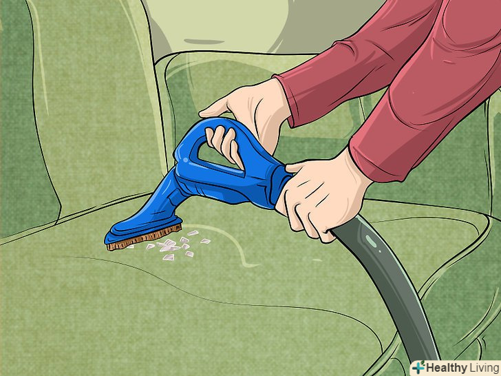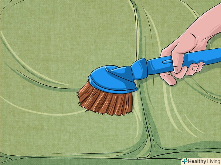 Пропилососьте диван, щоб прибрати крихти. перш ніж наносити засіб для чищення, обов'язково гарненько пропилососьте диван. Це дозволить прибрати будь-які крихти і сміття з затишних куточків і западин. Використовуйте знімну щітку для оббивки, якщо вона у вас є, щоб прибрати шерсть тварин, бруд і сміття. Не забудьте також пройтися по важкодоступних місцях, особливо між подушками. [4]- Якщо у вас немає пилососа, візьміть щітку з короткою рукояткою, щоб прибрати з дивана бруд і сміття.