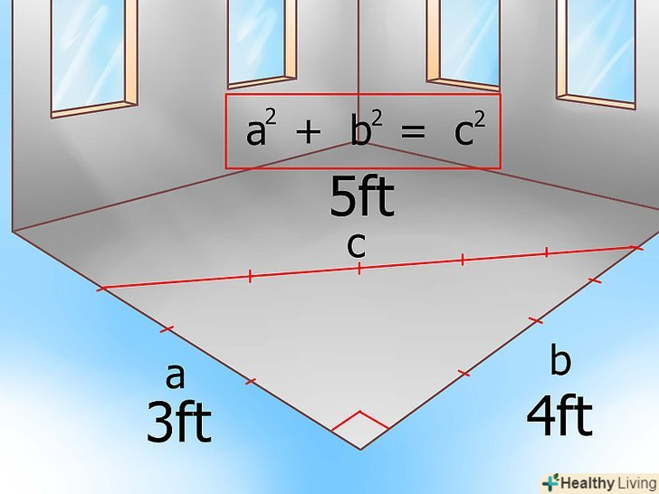 За допомогою будівельного рівня/лінійки виміряйте відстань між вашими відмітками. якщо ця відстань відповідає 5 м, то даний кут становить рівно 90°.- Використовувану математичну формулу називають теоремою Піфагора. Вона говорить, що сума квадратів коротких сторін прямокутного трикутника дорівнює квадрату його довгої сторони: a 2 + b 2 = c 2 . Цією теоремою описуються тільки прямокутні трикутники, так що якщо ваші вимірювання не вписуються в рівняння, то кут трикутника не дорівнює 90°.