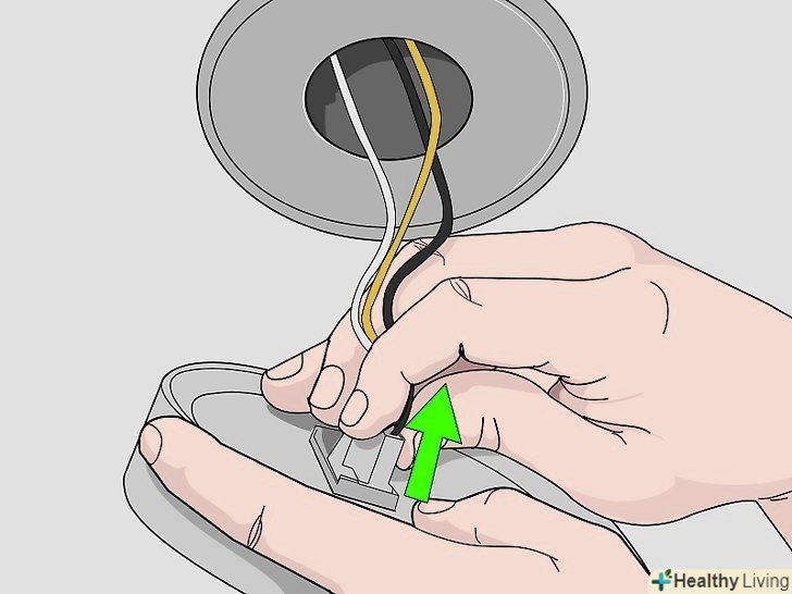 Вийміть з сигналізації джерело живлення, щоб повністю знеструмити його. якщо в сигналізації немає кнопки відключення звуку або вам потрібно відключити її на тривалий проміжок часу, спробуйте витягти її джерело живлення. Покрутіть пристрій проти годинникової стрілки, а потім витягніть його з монтажного отвору. Якщо детектор диму підключений до системи сигналізації, витягніть кабель, яким він кріпиться до стіни або стелі, і витягніть будь-які додаткові джерела живлення. Якщо пристрій є автономним, просто витягніть з нього батарейки. [12]- У деяких сигналізаціях батарейки можуть бути приховані за зрушується або прикрученою панеллю.