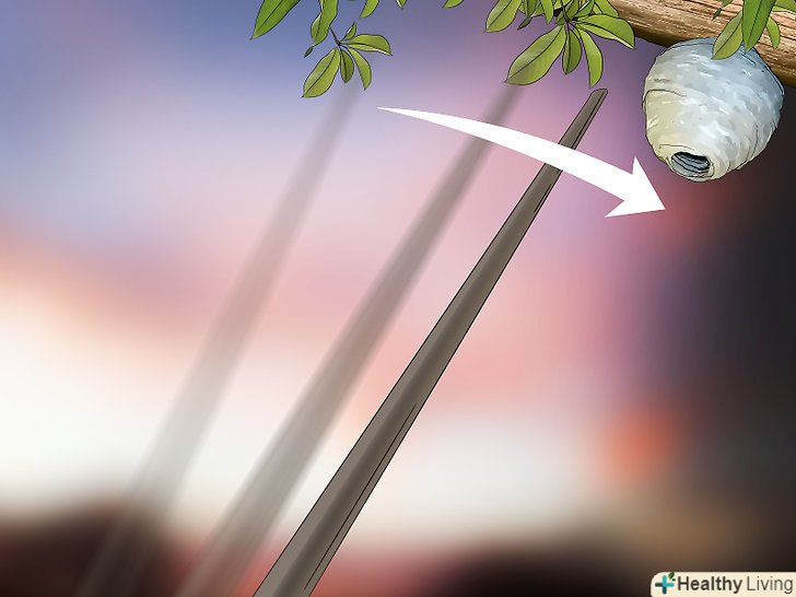 Збийте гніздо на початку теплого сезону або після того, як обробите його інсектицидом. якщо гніздо ще невелике або ви обприскали його інсектицидом, спробуйте збити його на землю шваброю, граблями або довгою палицею. [9]- Якщо оси живі, необхідно регулярно збивати гнізда, щоб відвадити їх від своєї ділянки. Зазвичай потрібно робити це кілька разів, перш ніж оси переберуться в будь-яке інше місце.