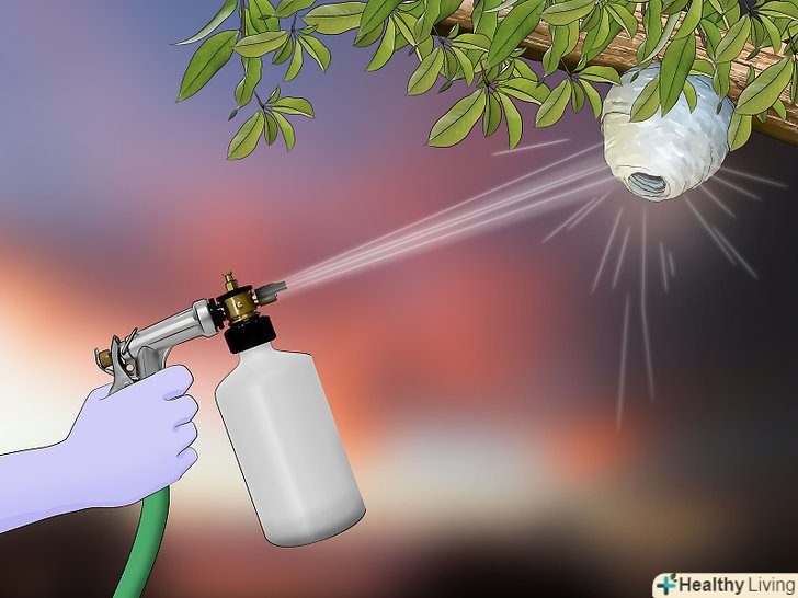 Нанесіть інсектицидиНа гніздо, ос і уподобані ними місця. вивчіть вказівки щодо застосування і дізнайтеся, який обсяг кошти потрібно на один квадратний метр площі. Розведіть засіб з розрахунку 30 грамів на 4 літри води. З настанням теплого сезону постарайтеся якомога раніше обприскати засобом ті місця, де з'являються оси. Приділяйте особливу увагу замкнутим приміщенням з закриваються вікнами і дверима. [3]- Наносите інсектицид прямо на окремих ос або на все гніздо, відповідно до вказівок щодо застосування.