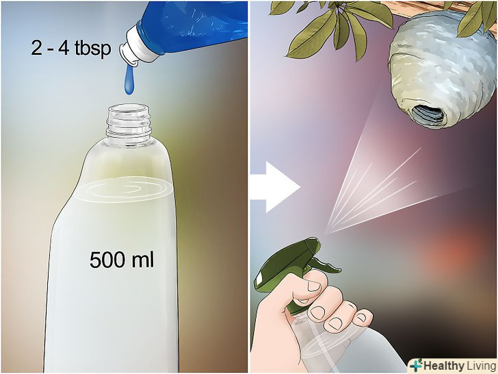 Змішайте 1 столову ложку (15 мілілітрів) масла перцевої м'яти і приблизно 2 склянки (480 мілілітрів) води. налийте воду в пляшку з розпилювачем і додайте в неї масло перцевої м'яти. Побризкайте розчином на ос і їх гнізда. Використовуйте достатньо розчину, щоб він як слід змочив комах і гнізда. [1] .- Спробуйте додати 2 столові ложки (30 мілілітрів) шампуню або рідкого засобу для миття посуду — в цьому випадку масло перцевої м'яти краще пристане до поверхні, і оси задихнуться.