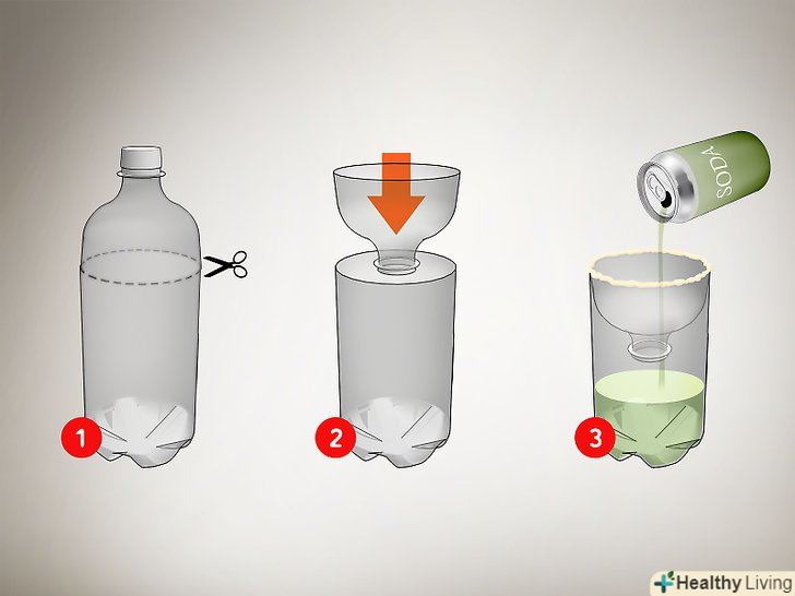 Зробіть водяну пастку з 2-літрової пластикової пляшки. відріжте горлечко пластикової пляшки, зніміть з нього кришку, переверніть догори ногами і покладіть на нижню частину пляшки. Скріпіть дві частини пляшки по периметру скотчем або пакувальною стрічкою. Після цього залийте в пляшку воду з цукром або солодку газовану воду (можна також покласти шматочки м'яса або іншу білкову їжу). Підвісьте вийшла пастку за допомогою скотча або прикрутіть її до дерева. [7]- Змастіть похилі краї пастки рослинним маслом, щоб оси зісковзували з них вниз.