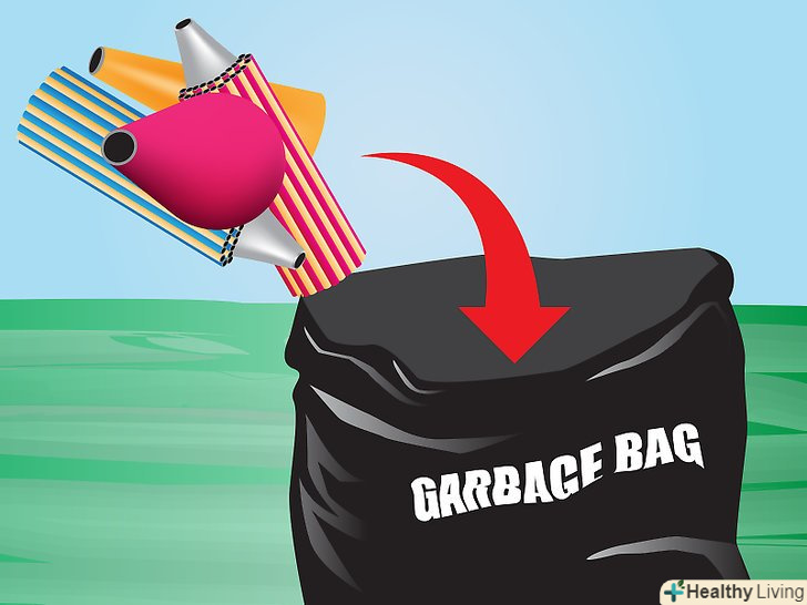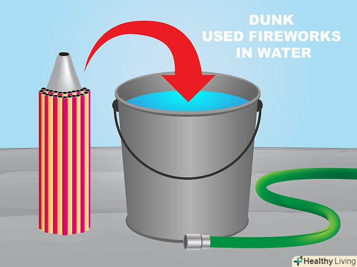 Занурте використаний феєрверк у воду. занурте феєрверки у велике відро з водою, поки вони повністю не охолонуть, а вогники не згаснуть. Залиште їх воді як мінімум на 15 хвилин, а краще на всю ніч. Це стосується всіх використаних і нерозірваних феєрверків і бенгальських вогнів.- Не замочуйте феєрверки, стоячи поруч з ними. Вилийте на феєрверки воду з відра або полийте їх з садового шланга.