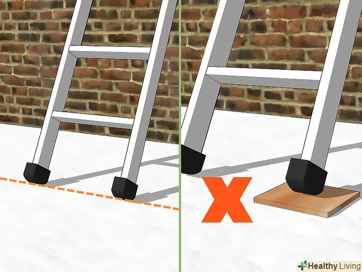 Вирівняйте ноги. навіть якщо сходи стоять під правильним кутом, вона все одно може впасти на бік, якщо її ніжки не будуть вирівняні, і не будуть стояти на твердому грунті. Установка дощок для вирівнювання однієї з ніжок є небезпечною. Замість цього краще викопайте невелику ямку під тією ніжкою, що стоїть вище. Для цієї роботи ідеально підійде інша частина молотка.