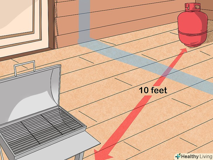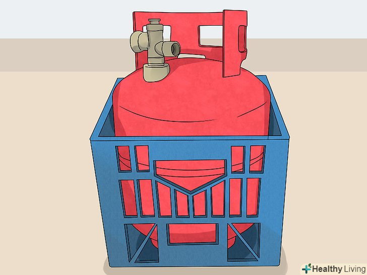 Зберігайте балон не менше ніж в 3 метрах від легкозаймистих матеріалів. це включає в себе джерела відкритого полум'я і різні електричні прилади. Не зберігайте зайві балони поруч один з одним або біля гриля. Якщо один балон випадково загориться, краще, щоб інші при цьому не стояли поруч. [5]
