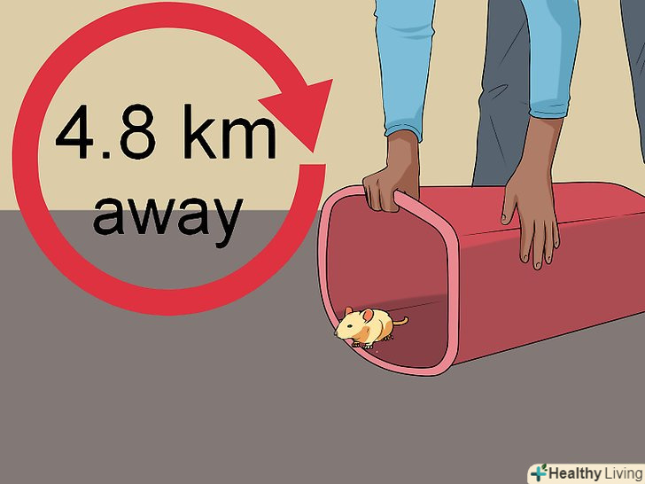 Винесіть мишу назовні. спійману мишу необхідно віднести хоча б на півтора кілометра від будинку, інакше вона може повернутися назад. Щоб миша не зловили хижаки, випустіть її хоча б в п'яти кілометрах від будинку. Виберіть приховану ділянку, наприклад ліс, повалені дерева або кам'янисту грунт, і подумайте про те, щоб залишити там їжу до тих пір, поки миша не обживеться на новому місці. [9]- В якості їжі підійдуть сирі вівсяні пластівці, арахіс, пташиний корм або сухий корм для домашніх тварин.