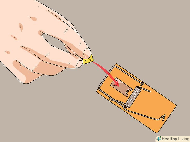 Покладіть приманку в пастку. не використовуйте занадто багато приманки. Візьміть приманку розміром з горошину і надійно закріпіть її всередині пастки. Багато хто використовує занадто велику кількість приманки-наприклад, в разі пружинної мишоловки це дозволяє миші з'їсти приманку, не наступивши на пастку. [3]- Краще покласти в пастку приманку до того, як встановити її. Наприклад, якщо ви будете класти приманку в уже заведену пружинну мишоловку, то можете зачепити пусковий механізм, і пастка вдарить вас по пальцях.
