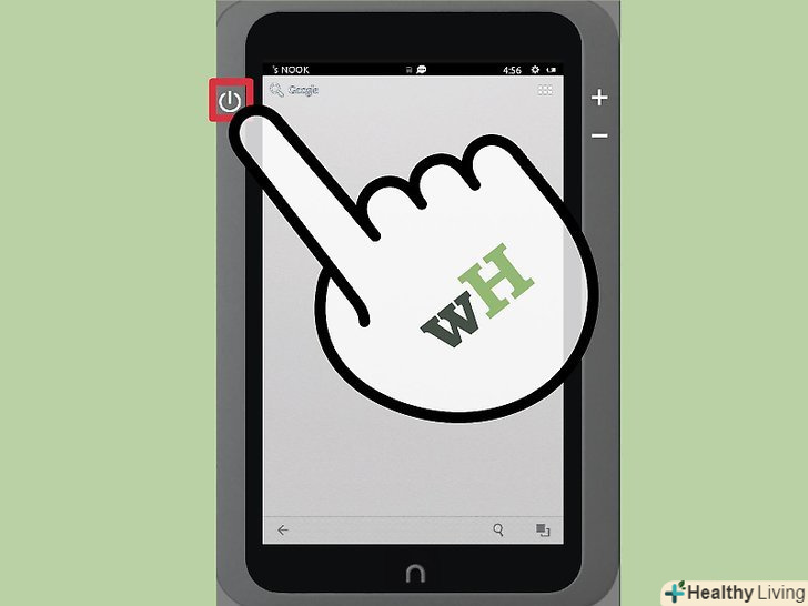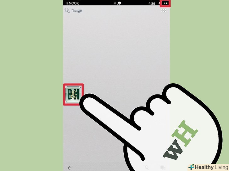 Зарядіть планшет перед включенням.на офіційному сайті підтримки Nook рекомендується зарядити акумулятор перед першим використанням планшета. Використовуйте комплектний кабель для зарядки, щоб підключити Nook HD до розетки. Після повної зарядки планшета маленький індикатор поруч з роз'ємом для зарядки буде світитися зеленим.- Зазвичай для повної зарядки батареї потрібно від чотирьох до п'яти годин.[1] якщо ви не хочете чекати так довго, то ви можете просто підключити Nook до розетки і відразу перейти до виконання нижчеописаних дій.