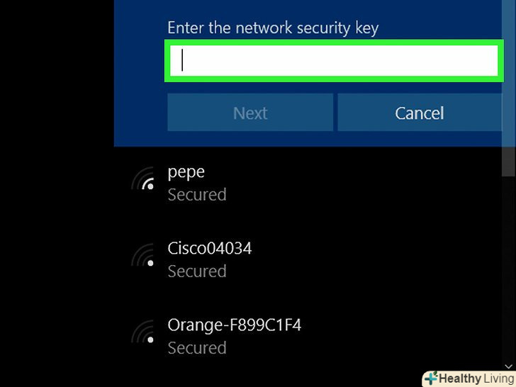 Введіть пароль до мережі.у текстовому полі, що відобразилося, введіть пароль, який використовується для підключення до мережі.- Якщо ви не змінювали пароль за замовчуванням, його можна знайти на наклейці на нижній або задній панелі маршрутизатора (або модему з маршрутизатором).