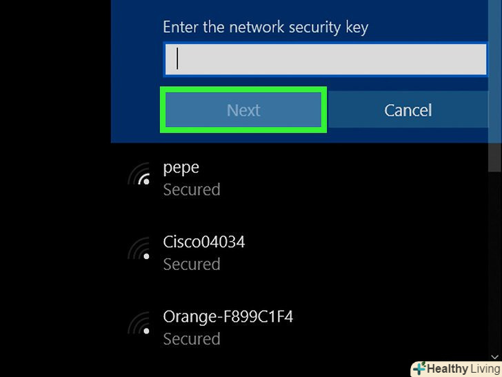 Клацніть поДалі.ця опція знаходиться під полем з паролем. Комп'ютер спробує підключитися до мережі.- Якщо пароль невірний, введіть його ще раз.