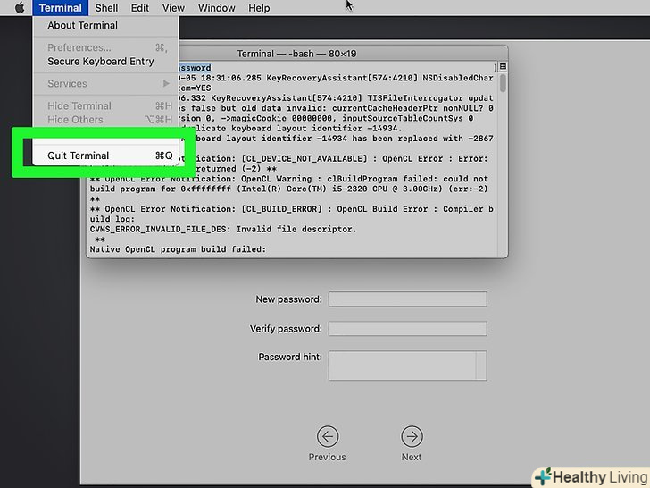 Закрийте термінал. коли у фоновому режимі відкриється вікно скидання пароля, клацніть по значку у вигляді червоного кола у верхньому лівому кутку вікна терміналу.