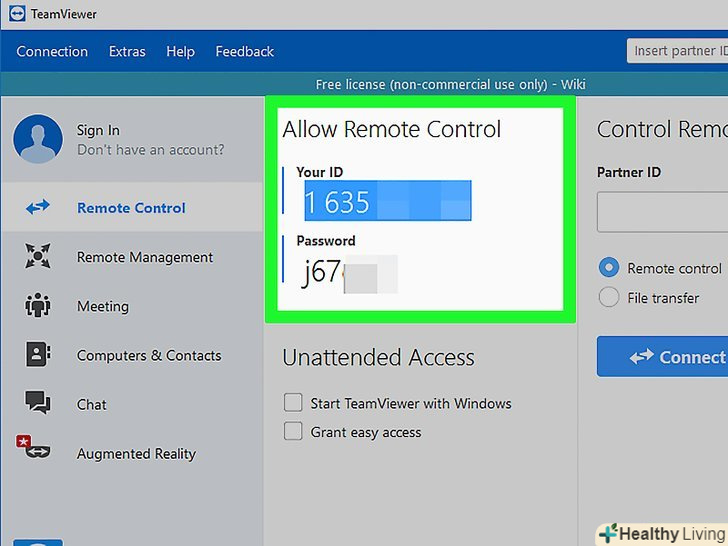 Знайдіть ідентифікатор і пароль віддаленого комп'ютера. у лівій частині вікна TeamViewer є рядки «ідентифікатор» і «Пароль " з цифрами і символами. Щоб отримати доступ до віддаленого комп'ютера, потрібно знати і ідентифікатор, і пароль.