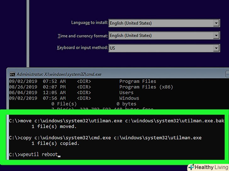 Перезавантажте комп'ютер. Введіть wpeutil reboot в командному рядку, а потім натисніть ↵ Enter. Але спочатку відключіть флеш-накопичувач від комп'ютера, щоб завантажити Windows, а не запустити процес установки цієї системи.[1]- Якщо ви не відключили флеш-накопичувач і почалася установка Windows, вийміть флешку, а потім натисніть (або натисніть і утримуйте) кнопку живлення на корпусі комп'ютера.