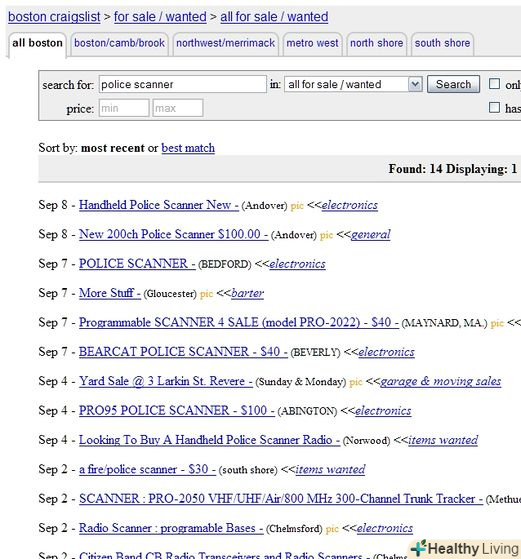 Знайдіть список радіочастот передач, які Вас цікавлять.придбайте посібник із сканування в мережі магазинів радіотоварів або книжковому магазині. Дуже часто ці книги продаються по розділах-в залежності від цікавить Вас місцевості, а також сфери – замість змісту трансляцій всіх частот (таксі, Бізнес і аматорських радіостанцій і т.д.) просто частоти поліції, пожежних і швидкої допомоги. Google також є безкоштовним джерелом потрібної Вам інформації. Ввівши в Google "сканер радіочастот Бостона", Ви отримаєте список радіочастотних каналів Бостона, штат Массачусетс. Замість слова "Бостон" введіть в пошуковий рядок назву вашого міста, населеного пункту, округу або штату.