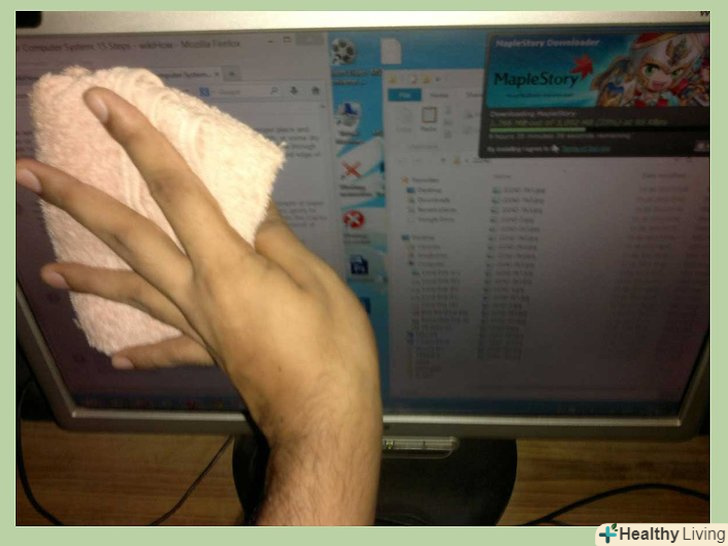 Протріть монітор.LCD-дисплеї (а такі у більшості лаптопів) добре очищаються мокрою безлінтовой тканиною (наприклад, мікрофіброю). Намочіть тканину і протріть їй монітор. CRT-Монітори (великі такі) краще чистити засобами для чищення скла - але не забувайте, що засіб для чищення треба наносити на тканину, а не на монітор.- Деякі засоби для очищення скла містять аміак, а він може пошкодити покриття CRT-моніторів. Ось чому для цих цілей слід брати засоби для чищення скла, що не містять аміак.