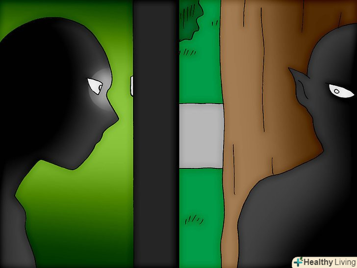 Вбравшись в костюм і зафіксувавши маску як слід, сховайтеся десь, де вас не буде видно, і обов'язково виберіть таке місце, щоб ви могли легко вибратися з нього, не зробивши з себе посміховисько.- Якщо у вас є дверний вічко, ви можете легко сховатися за закритими дверима. Тільки переконайтеся, що Ви нікого/нічого не зачепите дверима, коли будете відкривати її.