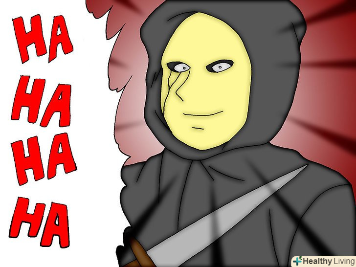 Повільно просувайтеся в бік дітей, які стояли недалеко і бачили все, що відбувається і ваше мачете. не смійтеся і не посміхайтеся, так як це може зіпсувати ефект. Якщо ви не в силах стримати посмішку, зробіть її диявольською і страшною. Заздалегідь попрактикуйтеся так посміхатися перед дзеркалом, поки не стане виходити чудово і переконливо.