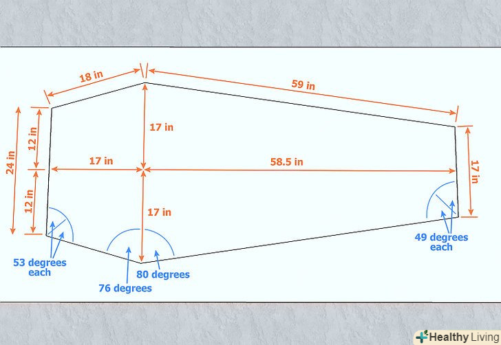 Створіть свій шаблон. використовуйте фанеру або інші великі аркуші паперу (проста біла задня частина подарункової упаковки, або газетні рулони, якщо ви економите гроші) і склейте частини разом так, щоб у вас був один досить великий лист, щоб помістити дизайн для труни. Зверніть увагу на те, що це не шаблон для основи, яка буде трохи меншою, а скоріше це - шаблон для труни з бічними сторонами, що прикріплюються до зовнішніх країв основи. Цей шаблон дозволить вам отримати правильні розміри сторін труни і правильні кути, під якими потрібно обрізати. Малюнок 1 для розмірів труни. Використовуйте рейсшину або квадрат теслі, спочатку намалюйте дві перпендикулярні лінії в середині. Потім намалюйте верхню і нижню сторони, в кінці з'єднайте кінцеві точки ліній для формування сторін як показано.