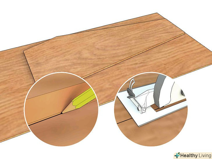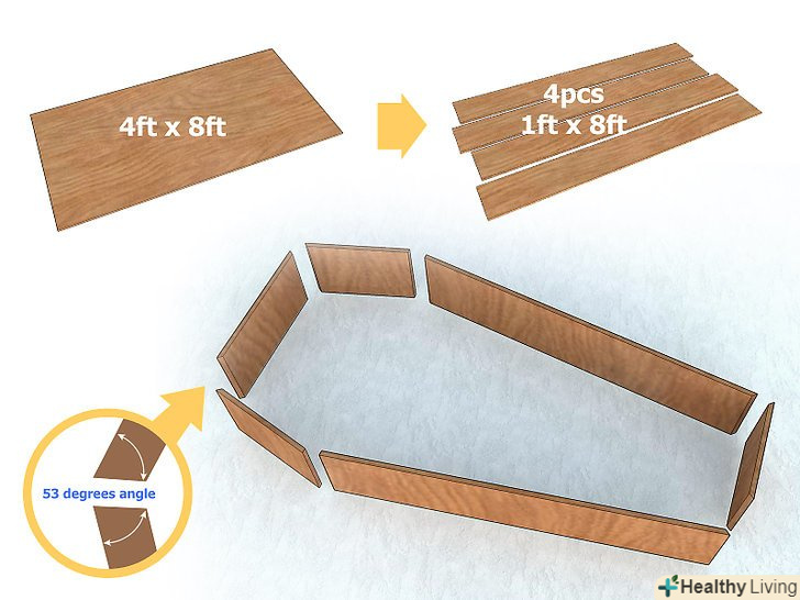 Обріжте сторони труни. сторони труни будуть 0,3 м. у висоту, тому візьміть одну з 1,2 x 2,4 м. фанерних панелей і розріжте його поздовжньо на чотири 0,3 x 2,4 м. частини ( вам знадобляться три з них, для створення сторін). Скористайтеся циркулярною пилкою, щоб обрізати бічні сторони, відповідно до розмірів на малюнку 1. Переконайтеся, що ви обрізали краї сторін під правильними кутами так, щоб вони поєдналися. Наприклад, сторона у верхній частині " труни повинна бути 60 см. (0,6 м.) шириною, і краю повинні бути обрізані під кутом 53 градуси.