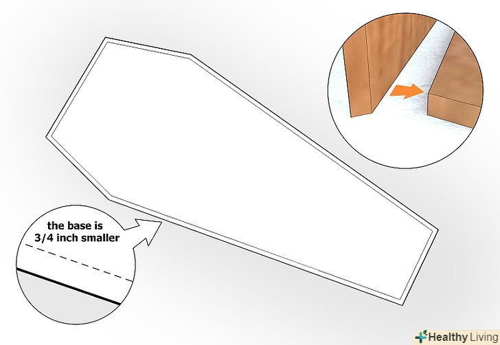 Виріжте кришку труни (за бажанням). Використовуйте цей крок, тільки якщо ви хочете кришку для труни. Помістіть підставу на те, що залишилося від 1,2 x 2,4 м. листа фанери так, щоб воно підходило виключно по дереву. Обведіть по краях, а потім приберіть основу. Виріжте верхню частину труни по лінії, яку ви намалювали.