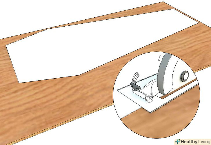 Виріжте основу труни. прикріпіть паперовий шаблон на залишилися 1,2 x 2,4 м.листи фанери так, щоб вершина найширшої області труни торкнулася краю. Скористайтеся циркулярною пилкою, щоб вирізати основу труни за шаблоном.