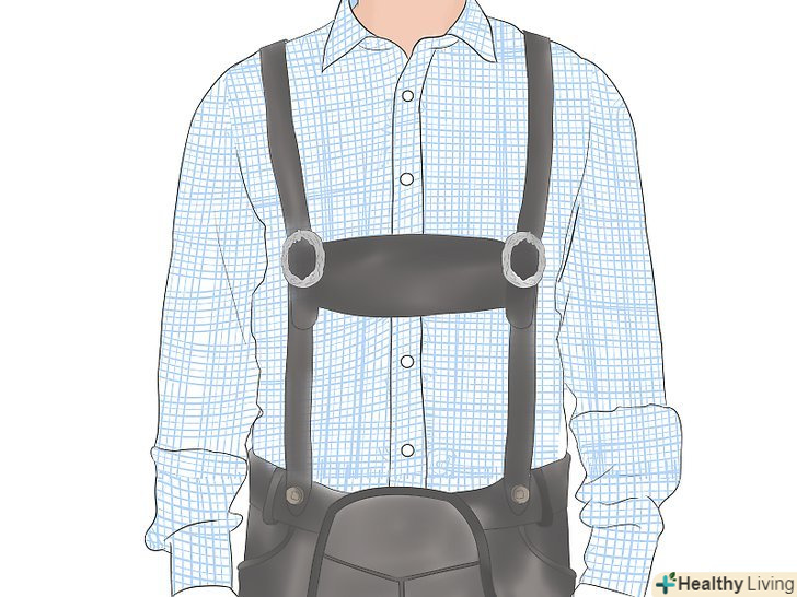 Одягніть якісь підтяжки. автентичні «леденхозен» можуть бути з підтяжками, але якщо ви купуєте їх окремо, спробуйте знайти які-небудь під колір ваших бриджів. Одягніть якісь підтяжки. автентичні «леденхозен» можуть бути з підтяжками, але якщо ви купуєте їх окремо, спробуйте знайти які-небудь під колір ваших бриджів.