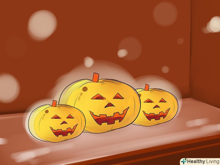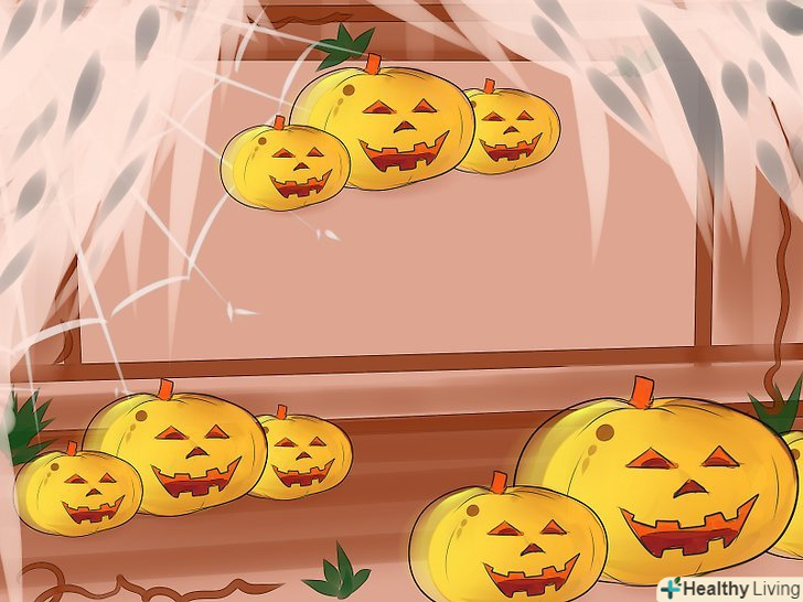 Підключіть гарбуза. Хеллоуїн - не Хеллоуїн, якщо немає гарбузів, тому ви просто зобов'язані включити їх в декорації. Не переборщіть з кількістю, а продумайте, як би їх вигідно уявити, щоб будинок виглядав брр-страшно. [2] Підключіть гарбуза. Хеллоуїн - не Хеллоуїн, якщо немає гарбузів, тому ви просто зобов'язані включити їх в декорації. Не переборщіть з кількістю, а продумайте, як би їх вигідно уявити, щоб будинок виглядав брр-страшно. [2]- Розвішайте гарбузові кулі. Купіть кілька помаранчевих куль і намалюйте на них моторошну пику чорним фломастером. Розкидайте по підлозі або підвісьте їх на стелю.