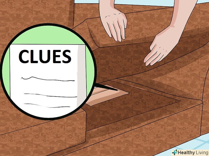 Помістіть підказки там, де люди зможуть їх знайти. велика частина дії буде проходити навколо обіднього столу або іншого обраного вами місця, тому підказки буде непогано помістити, скажімо, під тарілки або стільці гостей або під диванні подушки. Якщо ви хочете, щоб гості пересувалися, помістіть підказки в інші місця, наприклад на книжкові полиці або в ящики столу. Помістіть підказки там, де люди зможуть їх знайти. велика частина дії буде проходити навколо обіднього столу або іншого обраного вами місця, тому підказки буде непогано помістити, скажімо, під тарілки або стільці гостей або під диванні подушки. Якщо ви хочете, щоб гості пересувалися, помістіть підказки в інші місця, наприклад на книжкові полиці або в ящики столу.