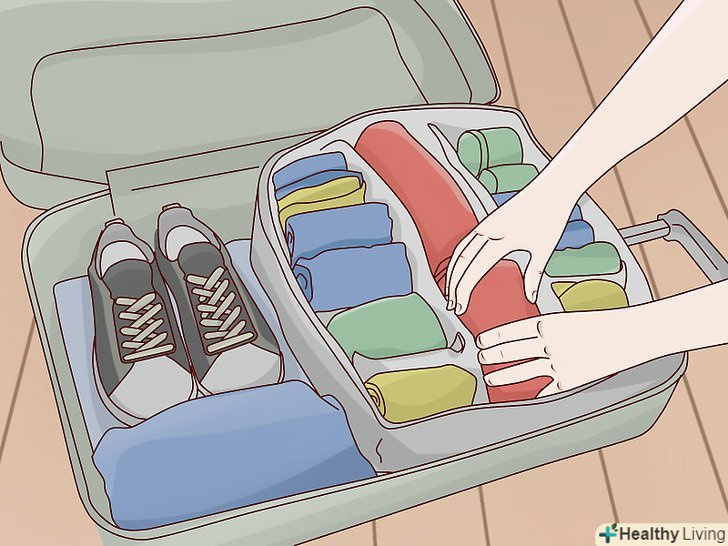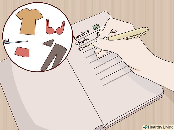 Складіть список всього, що вам потрібно буде взяти з собою. почніть з основних засобів гігієни і чистого одягу (обов'язково переконайтеся в тому, що все це поміститься в вашу сумку). Потім розставте пріоритети. Звичайно, вам обов'язково потрібна буде зубна щітка і зубна паста (і вони прекрасно поміщаються в сумку). Випрямляч або плойка для волосся – занадто великий предмет, до того ж, він не так вже вам потрібен, так що його можна сміливо залишити вдома. Отже, ось приблизний список того, що потрібно взяти з собою: Складіть список всього, що вам потрібно буде взяти з собою. почніть з основних засобів гігієни і чистого одягу (обов'язково переконайтеся в тому, що все це поміститься в вашу сумку). Потім розставте пріоритети. Звичайно, вам обов'язково потрібна буде зубна щітка і зубна паста (і вони прекрасно поміщаються в сумку). Випрямляч або плойка для волосся – занадто великий предмет, до того ж, він не так вже вам потрібен, так що його можна сміливо залишити вдома. Отже, ось приблизний список того, що потрібно взяти з собою:- Змінний одяг