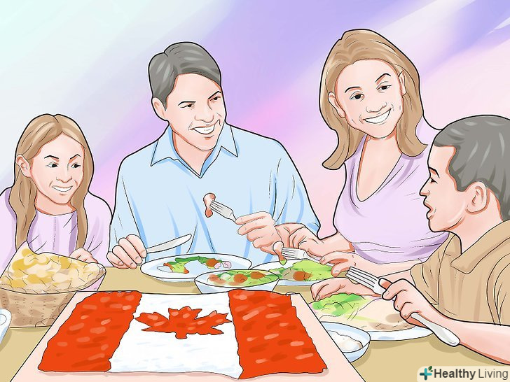 Одягніться в патріотичному стилі. це можна зробити за допомогою звичайної футболки із зображенням кленового листа або використовуючи прапор з кленовим листом, який буде спадати з ваших плечей. Проявіть творчий підхід і покажіть свою гордість за Канаду за допомогою червоно-білого вбрання! Нижче описані деякі ідеї про те, як вам краще застосувати кольори нації:- Фарбуйте волосся в яскраво-червоний колір за допомогою тимчасового кольорового лаку для волосся або використовуйте лак разом з трафаретом, форма якого – Кленовий лист.
