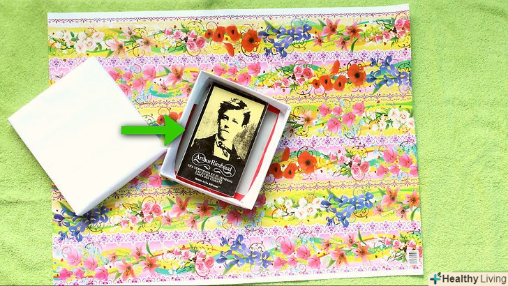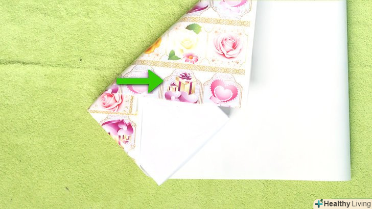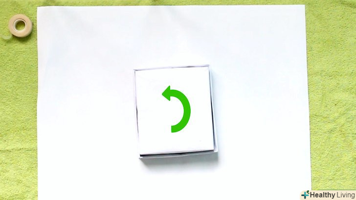 Покладіть коробку з подарунком на розташовану по діагоналі папір. розмістіть коробку з подарунком догори ногами, щоб нижня сторона дивилася вгору.- Коробка повинна лежати так, щоб тільки маленький трикутник в правому нижньому кутку коробки не був накритий папером.