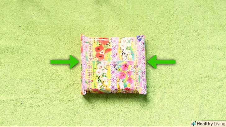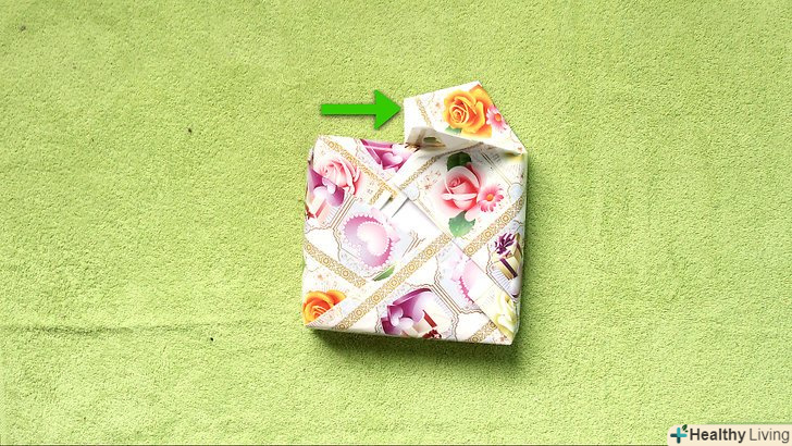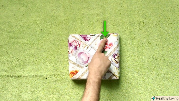 Обкладіть подарунок папером. на горизонтальній стороні паперу візьміть одну сторону і складіть її під подарунок. Потім складіть і іншу сторону. Ось тут вам і знадобиться зайвий сантиметр. Візьміть довшу сторону і складіть її внизу, щоб отримати не негарний розріз, а красиву гладку складку. Покладіть її на інший кінець і потягніть. Потім склейте кінці.