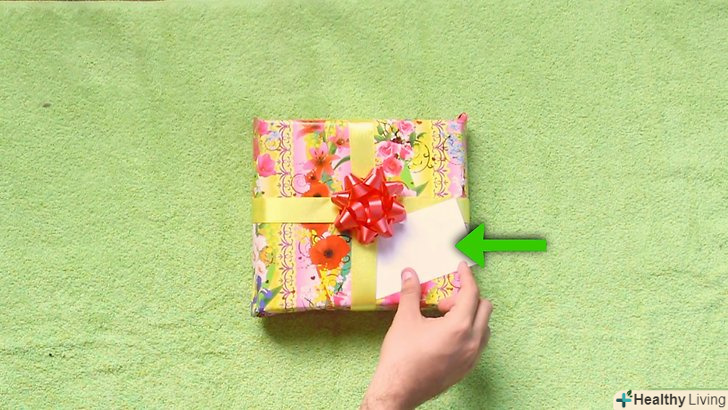 Додайте листівку. взявши листівку, напишіть «кому» і «від кого», ім'я і т.д. якщо у вас хороший почерк, це додасть особистого ставлення. Якщо немає, можна або надрукувати, або акуратно написати потрібне.- Якщо у вас поганий почерк чи немає листівок або наклейок, можна відрізати шматочок підходящої обгорткового паперу, скласти його в «листівку» і приклеїти, куди потрібно.