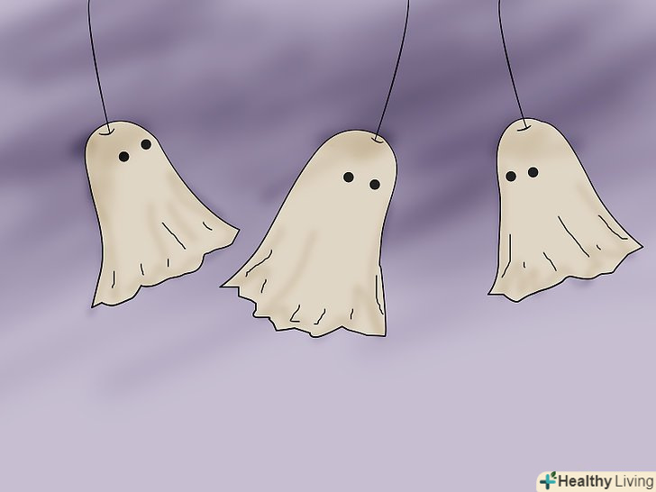 Прикріпіть очі з повсті і волосінь, щоб розвісити привидів. маленькі крапочки для очей – це все що потрібно, щоб зробити з цих хлопців красенів, і ні крапельки не зловісних. Чорні блиски або намистинки теж зійдуть.- Що стосується волосіні, то протягніть її через марлю і зав'яжіть на вузлик. Повісьте своїх дружбанів на лампи, полиці, вікна та стелю.