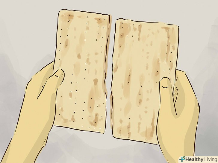 Розламайте мацу (хліб без дріжджів). розламайте на дві частини середню мацу (її називають «яхац»). Менший шматок покладіть назад в тарілку, а більший скибочку послужить «афікоманом», яким завершують трапезу. [10]