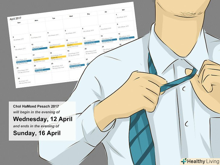 Відзначте дату Великодня. єврейська Пасха триває вісім днів. Вона починається на заході сонця на початку весни, в місяць Нісан за єврейським календарем. Дата початку Великодня змінюється щороку відповідно до того, коли за єврейським календарем починається місяць Нісан . Щоб дізнатися, коли точно починається Великдень в поточному році, загляньте в Єврейський календар. [1]- Якщо ви збираєтеся в гості на святкування Великодня До Євреїв, дізнайтеся у них точні дати.
