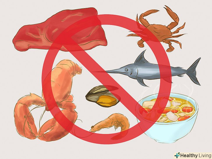 Уникайте під час Великодня забороненої їжі. як і протягом усього року, під час Великодня не можна їсти некошерне м'ясо (свинину, молюсків, омарів, креветок, крабів, кролятину), а також будь-які морепродукти без плавників або луски, наприклад рибу-меч і м'ясо осетрових риб. Не можна їсти і їжу, до складу якої входять ці інгредієнти. [5]- Також традиційні єврейські закони, що стосуються харчування, забороняють їсти м'ясо в поєднанні з молочними продуктами як під час Великодня, так і протягом усього року, тому не їжте сир, вершкове масло або вершковий соус разом з яловичиною або курятиною.