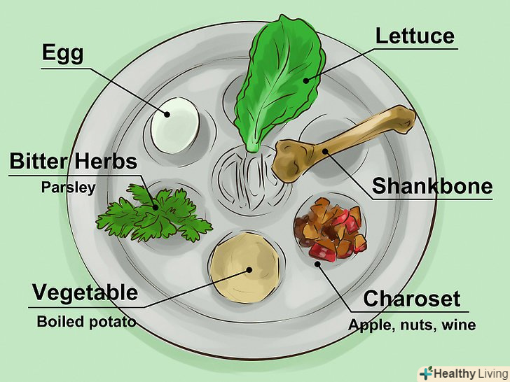 Зберіть блюдо для пасхального седера. найбільш важливим моментом при святкуванні Великодня є трапеза седер, яку зазвичай проводять в перший великодній вечір. Блюдо для седера відіграє центральну роль у святкуванні Великодня. Воно складається з шести символічних продуктів, а також трьох пластин маци, які кладуть на окрему тарілку. Ось ці шість символічних продуктів: [6]- Марор (гіркі трави). Традиційно це хрін, але можна використовувати також петрушку, зелену цибулю або селеру.