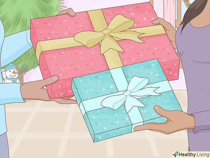 Заплануйте обмін подарунками з колегами по роботі. можна організувати новорічний захід, наприклад, звичайний обмін подарунками або гру «Таємний Дід Мороз». Просто напишіть імена учасників, покладіть їх у капелюх, перемішайте. Нехай кожен колега вибере ім'я того колеги, якого він повинен буде привітати. Заздалегідь позначте цінові категорії подарунків, а також тематику. Можна підкреслити, що подарунки повинні ставитися до робочого середовища. [19]- Щоб обмін подарунками вийшов абсолютно «випадковим», можна придумати гру, в якій кожен повинен купити подарунок. Обговоріть фінансову сторону і цінові межі подарунків. Розставте подарунки і позначте кожен з них своїм номером. Правила багато в чому схожі з грою» стільчик", де включається музика і всі бігають навколо подарунків. Як тільки музика зупиняється, кожен отримує найближчий до нього подарунок. [20]