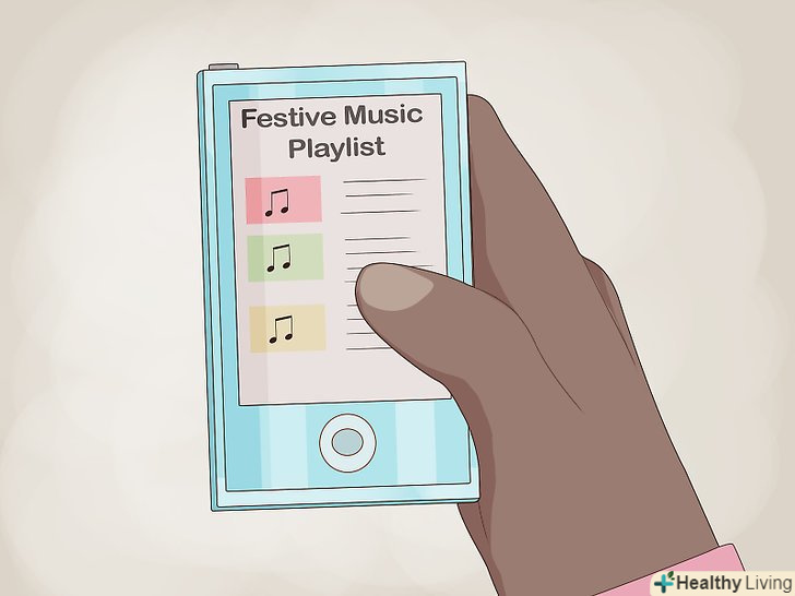 Створіть святковий музичний плейлист. незалежно від того, який жанр музики Вам подобається, швидше за все, є кілька новорічних пісень, які припадуть вам до смаку. Відмінною ідеєю буде урізноманітнити музику, але тільки ви знаєте, які пісні піднімуть вам настрій на весь сезон. Незалежно від того, чи віддаєте перевагу ви Слухати якусь окрему пісню або ж відразу завантажуєте готовий плейлист, важливо насолодитися звуками цього сезону. [6]- Є кілька популярних новорічних пісень, серед яких можна відзначити «Santa Baby» (виконує Мадонна), «All I want for Christmas is You» (виконує Mariah Carey), «You're a Mean One, Mr. Grinch "(виконує Thurl Ravenscroft), «Underneath the Tree» (виконує Kelly Clarkson), якісь пісні з новорічного альбому Michael Bublé's, «Новий рік» (виконує група «Дискотека Аварія»), а також «Пісенька про 5 хвилин» (виконує Людмила Гурченко). [7]